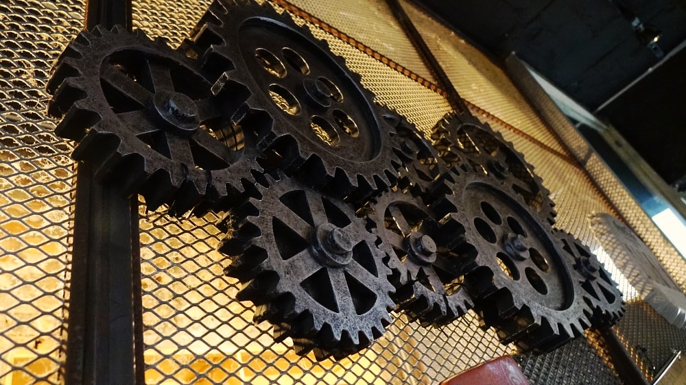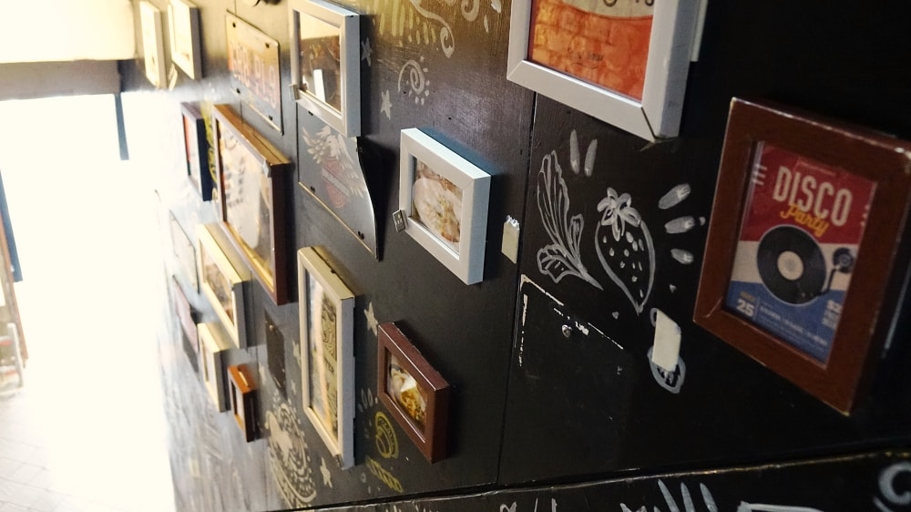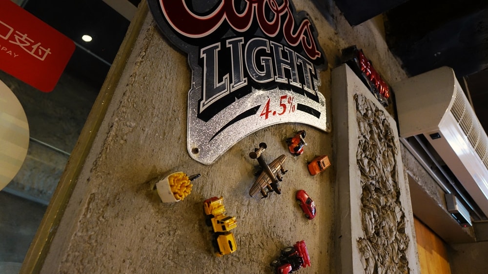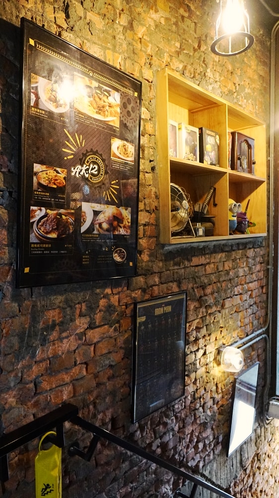 走道一上來的風格就是強烈地工業風,磚頭部分也不是用大圖輸出而是立體的磚頭,整個餐廳的質感就大大提升很多~.ᐟ.ᐟ 兩側都放滿了美式元素的裝飾,整體為了搭配風格燈光營造上偏暗,但不至於影響行走視線。樓梯通道左側是各式相框照片,原以為只是一般美式街景照片,其實裡面偷偷放置一些餐廳的特色餐點,給人有種尋寶的感覺~.ᐟ.ᐟ