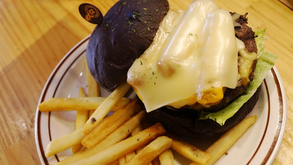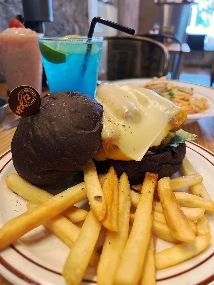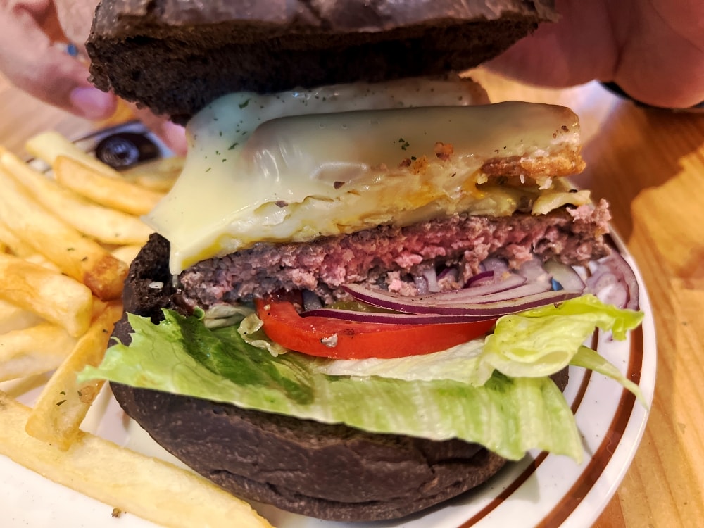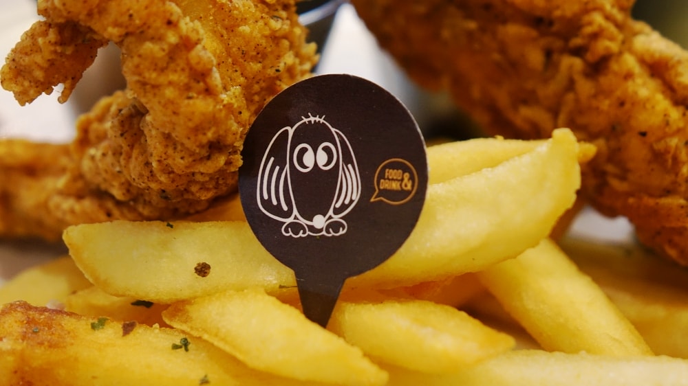 漢堡部分有個可以客製化的部分-麵包選擇:可更換為巧克力麵包,本來很猶豫要不要換,因為如果沒有更換小孩可以一起吃,但因為老闆說很多人換巧克力因為比較不會膩,就還是換了~ 其實個人覺得這款起司四重奏搭配巧克力很搭,因為四種起司其實都很香濃,搭配一個巧克力有達到平衡效果~.ᐟ.ᐟ 麵包上的小旗子也超級可愛~尤其背後那隻感覺很像臘腸的頭?! 有夠討喜~薯條部分就沒特別突出的部分了~